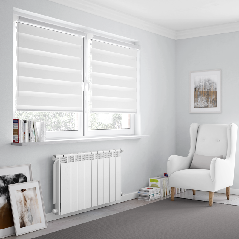 Rulou zebră/ Day&Night din material 100% poliester. Dimensiunea cu sistem este cu 4 cm mai mare decât dimensiunea pânzei.