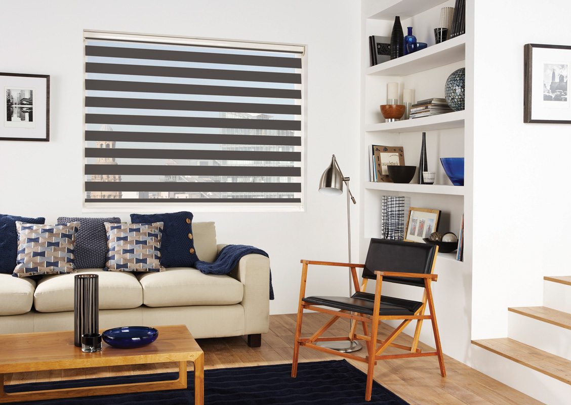 Jaluzea tip roletă zebră 1212 Semitransparentă, Day&Night, accesorii albe/ maro/ gri antracit, țesătură maro
