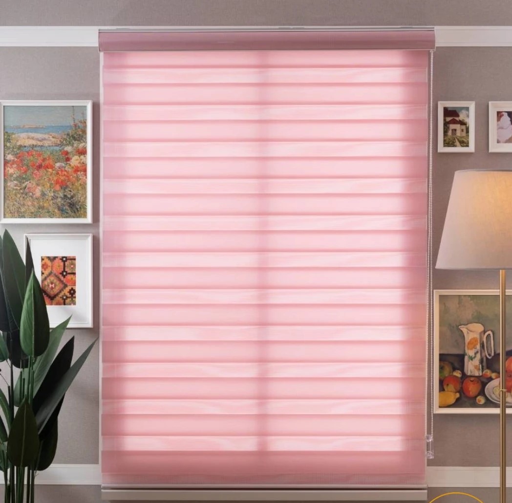 Jaluzea tip roletă zebră 1320 Semitransparentă, Day&Night, accesorii albe/ maro/ gri antracit, țesătură roz