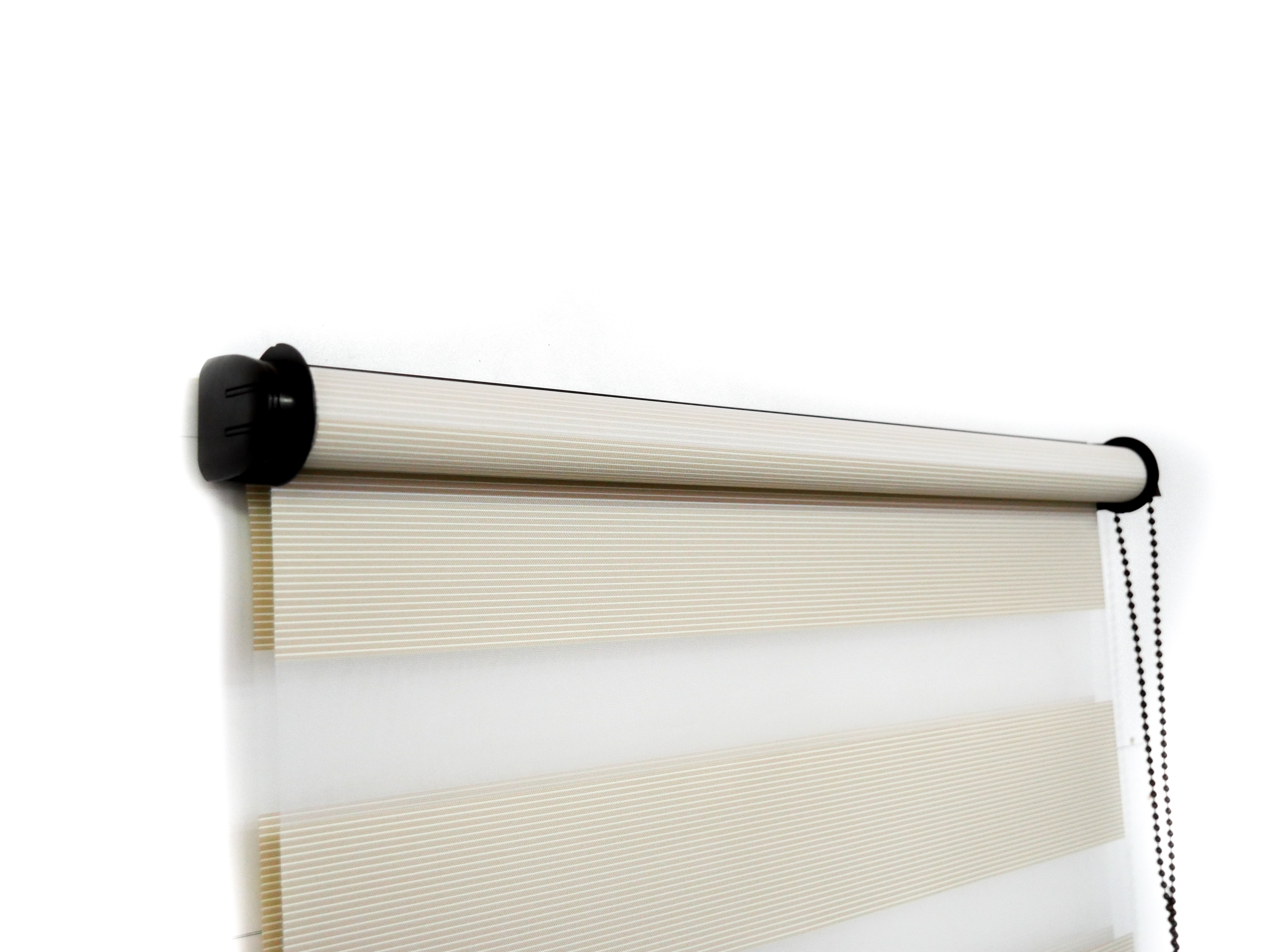 Jaluzea tip roletă zebră 2303 Semitransparentă, Day&Night, accesorii albe/ maro/ gri antracit, țesătură bej cu dungi